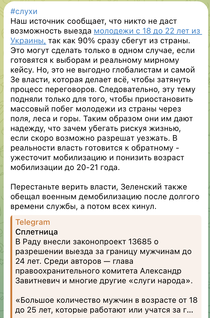 Это могут сделать только в одном случае, если готовятся к выборам и реальному мирному кейсу. Но, это не выгодно глобалистам и самой Зе власти, которая делает всё, чтобы затянуть процесс переговоров. Следовательно, эту тему подняли только для того, чтобы приостановить массовый побег молодежи из страны через поля, леса и горы. Таким образом они им дают надежду, что зачем убегать рискуя жизнью, если скоро возможно разрешат уезжать. В реальности власть готовится к обратному — ужесточит мобилизацию и понизить возраст мобилизации до 20-21 года.»
