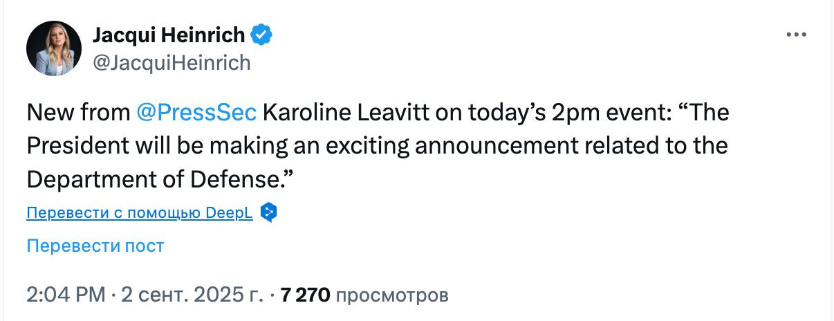 Анонсированное на вечер заявление Трампа будет связано не с Украиной, а с Пентагоном, сообщает журналистка Fox News Джеки Гайнрих со ссылкой на пресс-секретаря Белого дома Кэролайн Ливитт.