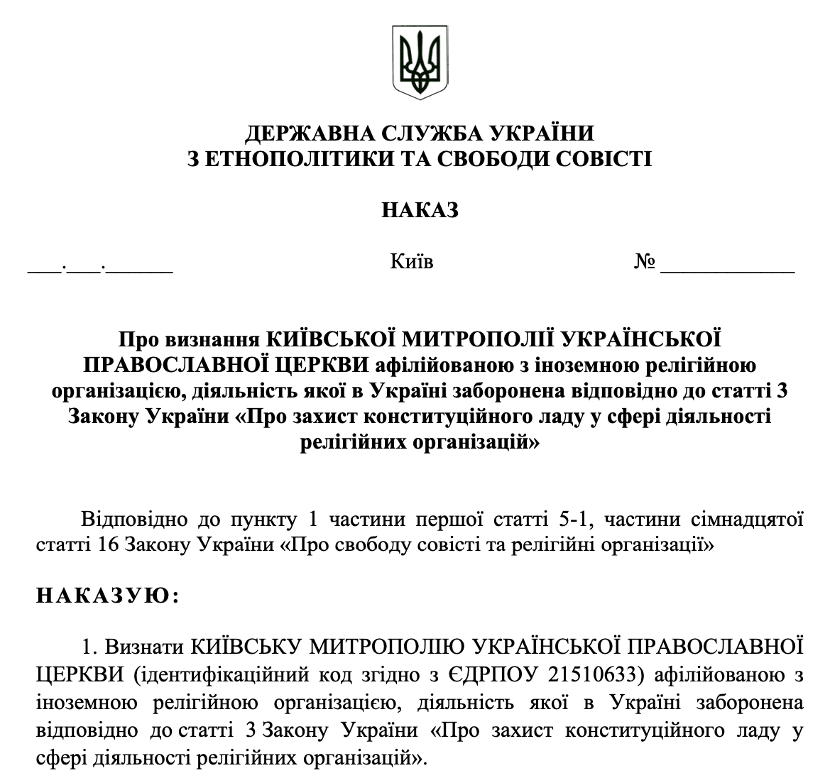 Государственная служба Украины по этнополитике и свободе совести (ДЕСС) приняла решение о признании Киевской митрополии Украинской православной церкви (УПЦ) «аффилированной с иностранной религиозной организацией» — Русской православной церковью (РПЦ) — чья деятельность запрещена на территории Украины. Это решение принято в соответствии со статьёй 3 Закона Украины «О защите конституционного порядка в сфере деятельности религиозных организаций»