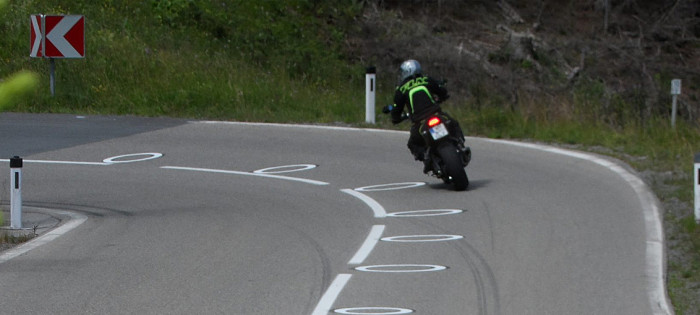Такая разметка в соседней Австрии на 40% снизила количество смертельных ДТП с участием мотоциклов. Наносят её в самых проблематичных местах — на поворотах и серпантинах.