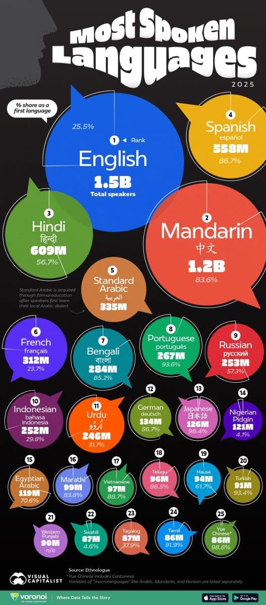 В новой инфографике, основанной на данных из справочника Ethnologue, представлен рейтинг 25 языков с наибольшим общим числом носителей в 2025 году.