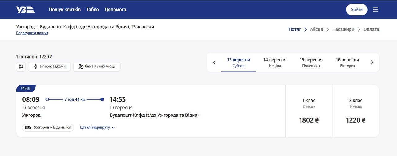 Билет из Ужгорода в Будапешт 1 класса будет стоить 1802 гривны, а за 2 класса — 1220 гривен.