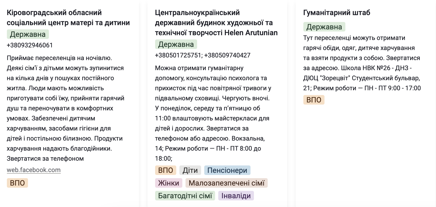 Один из таких пунктов работает на базе Кировоградского областного социального центра матери и ребенка. Здесь переселенцы, в том числе пенсионеры из их числа, могут найти временное убежище, получить бесплатное продовольство, средства гигиены и необходимые вещи для быта.
