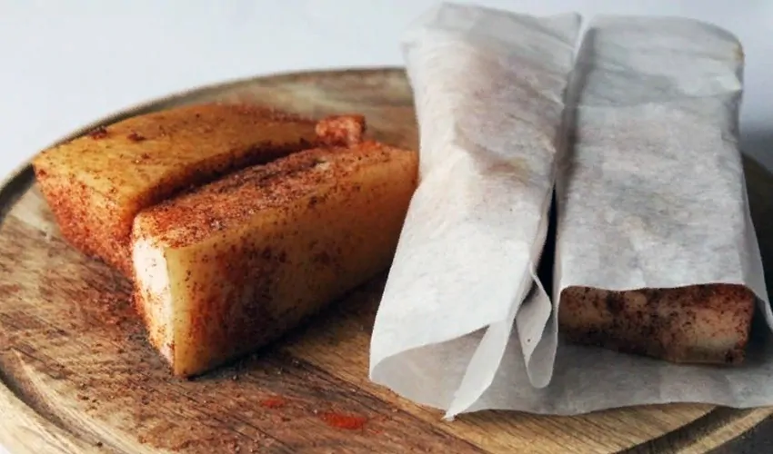- Нарезаем сало на небольшие кусочки, затем обмакиваем их с каждой стороны в сахар и заворачиваем в пергаментную бумагу.