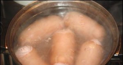 - После варки опустите сардельки в холодную воду на несколько секунд — это поможет оболочке легко слезть.