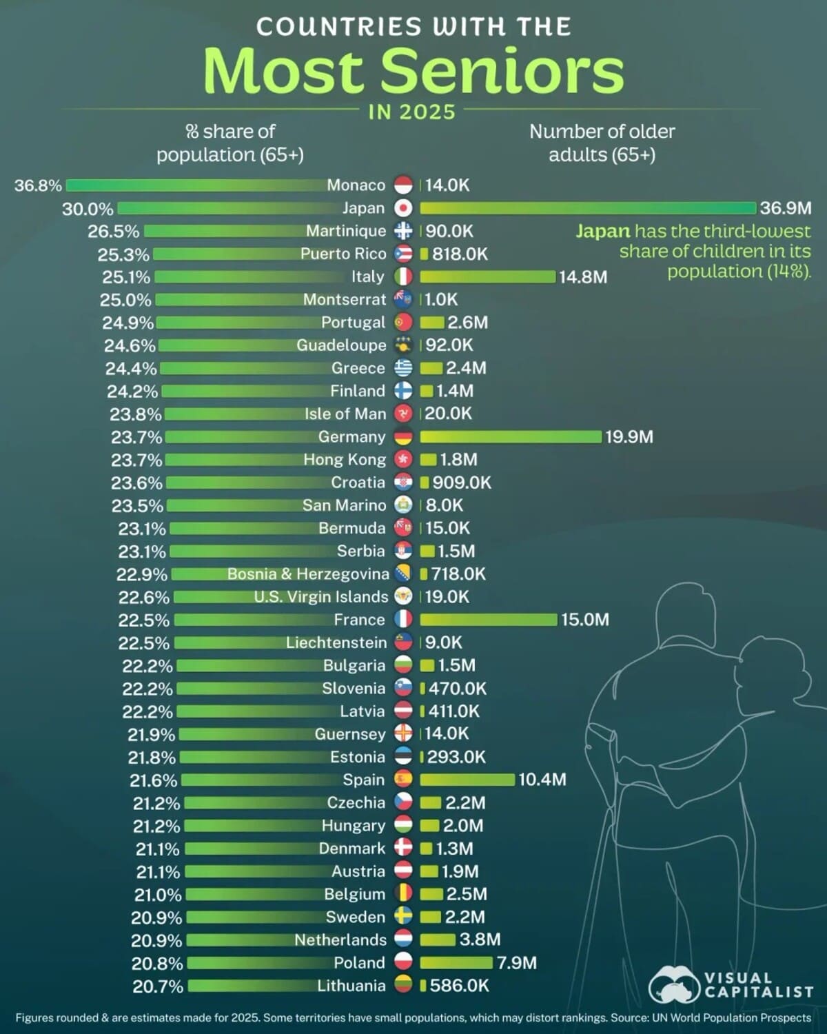 Этот материал, основанный на прогнозах ООН о Мировых демографических перспективах, покажет, в каких странах доля людей в возрасте 65 лет и старше является самой высокой по состоянию на 2025 год.