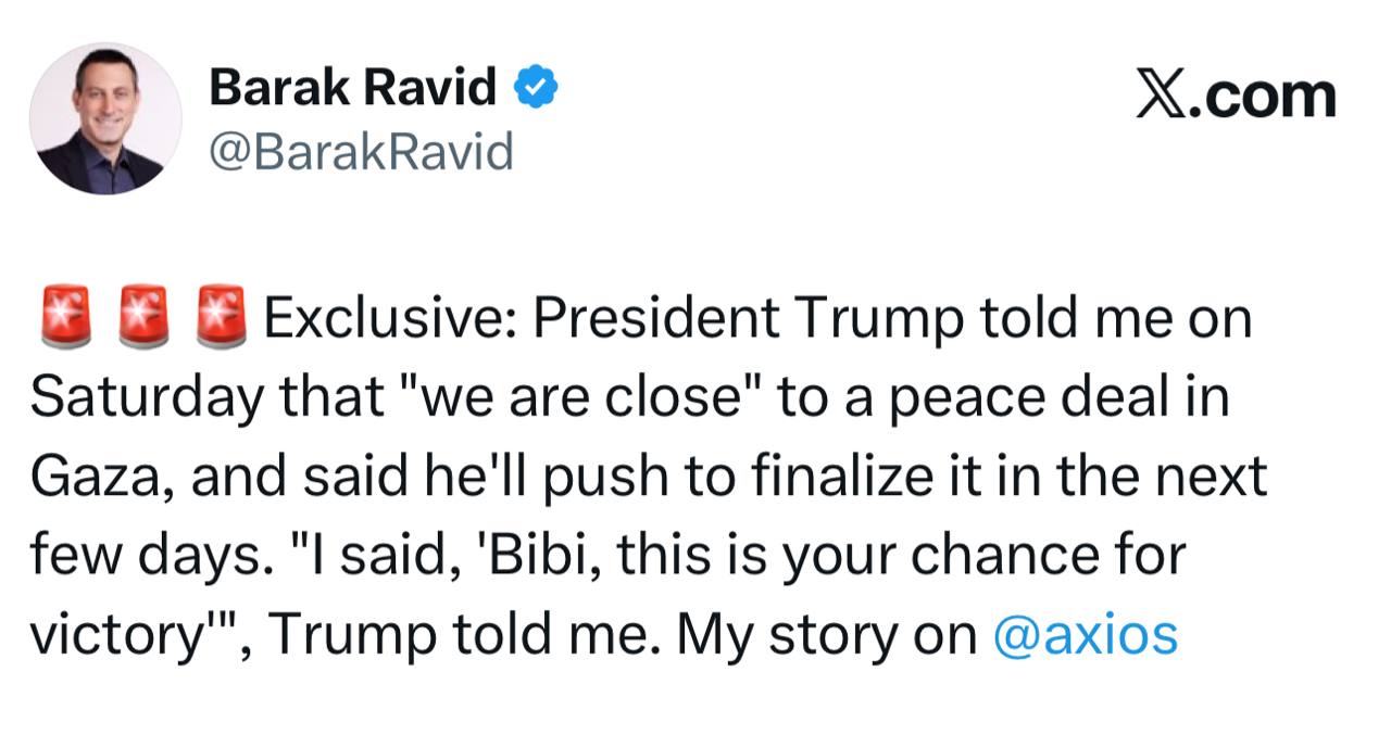«Президент Трамп сообщил мне, что «мы близки» к мирному соглашению в Газе, и он будет добиваться его заключения в ближайшие несколько дней. Трамп сказал Нетаньяху: «Биби, это твой шанс на победу»»