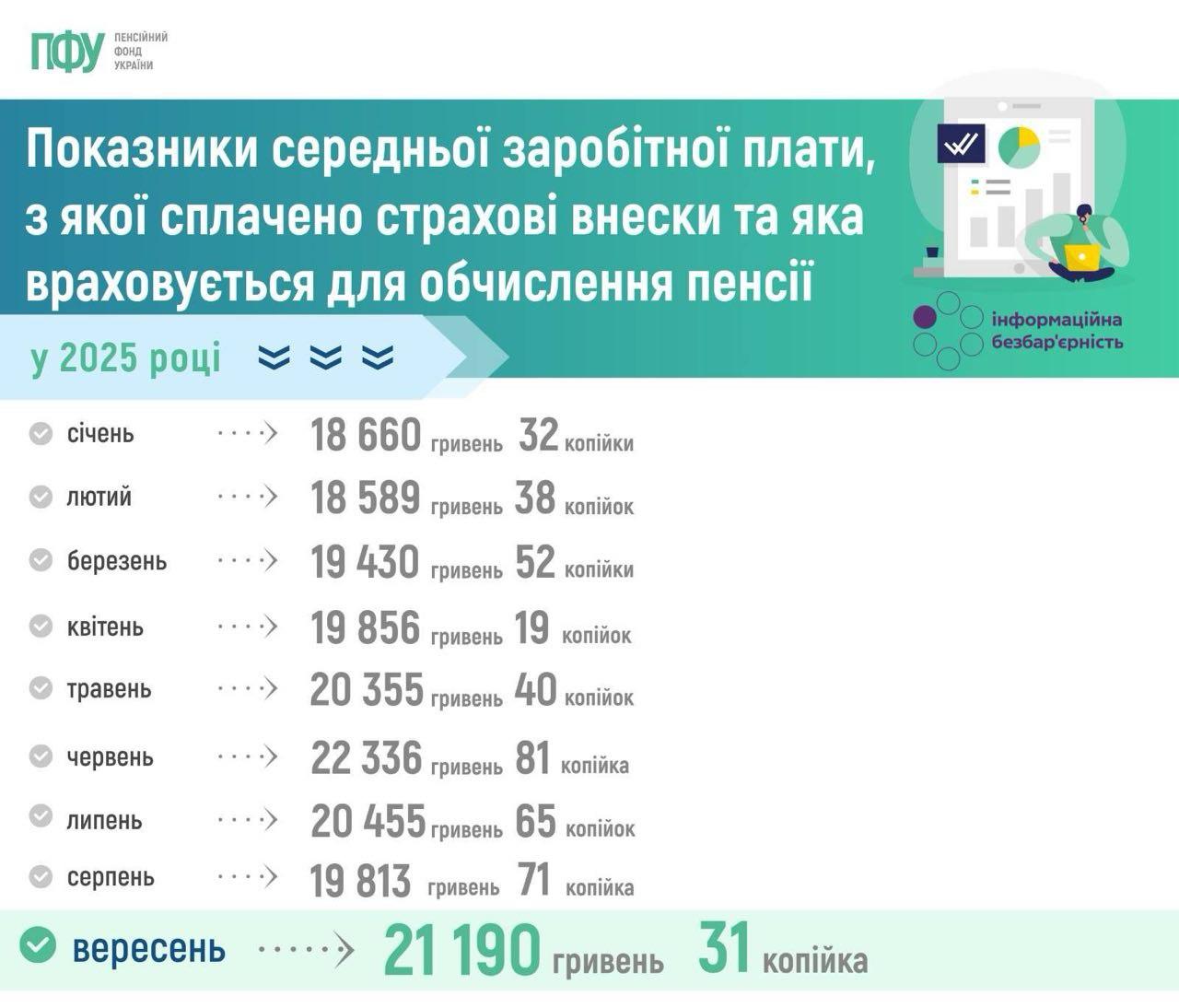 Вчера, 27 октября 2025 утвержден утвержденный показатель средней заработной платы (дохода) в Украине, с которой уплачены страховые взносы и которая в соответствии с Законом Украины «Об общеобязательном государственном пенсионном страховании» учитывается для исчисления пенсии, за сентябрь 2025 года. Он составляет 21190 гривен 31 копейку.
