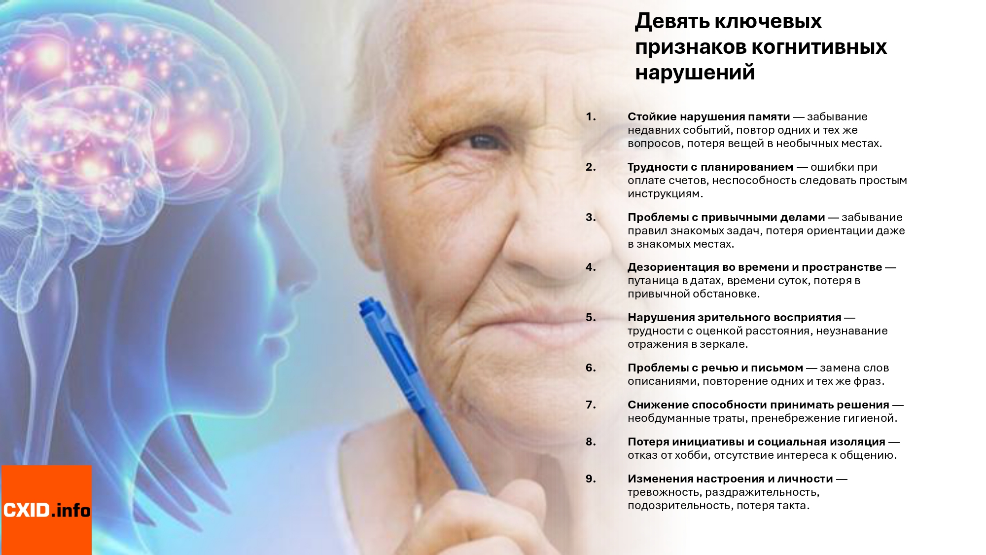 Инфографика 9 ключевых признаков деменции у пожилых. Автор: CXID.info