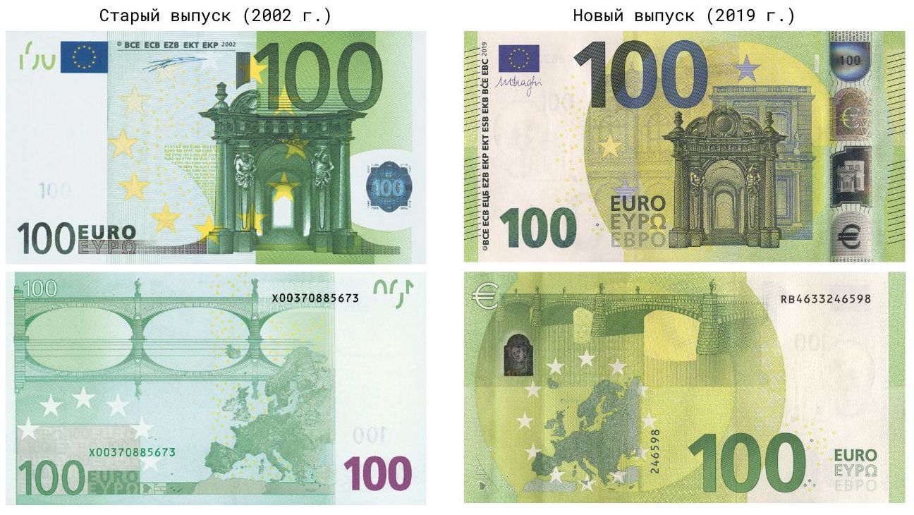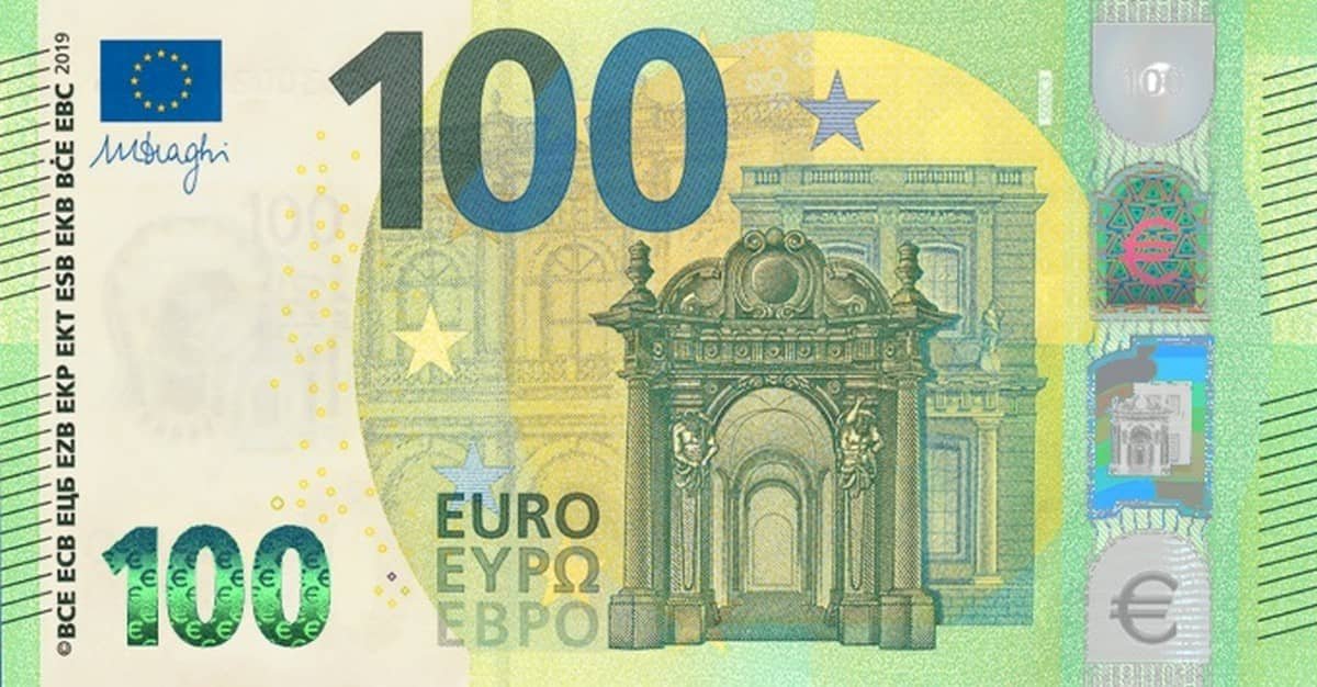 В 2019 году началась печать новых банкнот номиналов в 100 и 200 евро. Именно «сотка» относится к числу самых популярных во время наличных расчетов (занимает второе место после пятидесятки — ред.). Обновление тогда потребовалось для введения нескольких современных степеней защиты. Длина банкнот осталась прежней. Не изменился и цвет: купюра номиналом в 100 евро осталась зеленоватой. Однако новые деньги снабжены дополнительными защитными элементами. Помимо видимых глазу защитных знаков, новые банкноты содержат и специальные, которые может считывать только машина. Справа размещены большой символ евро, архитектурный мотив; голографическое изображение героини древнегреческих мифов Европы — дочери финикийского царя Агенора.