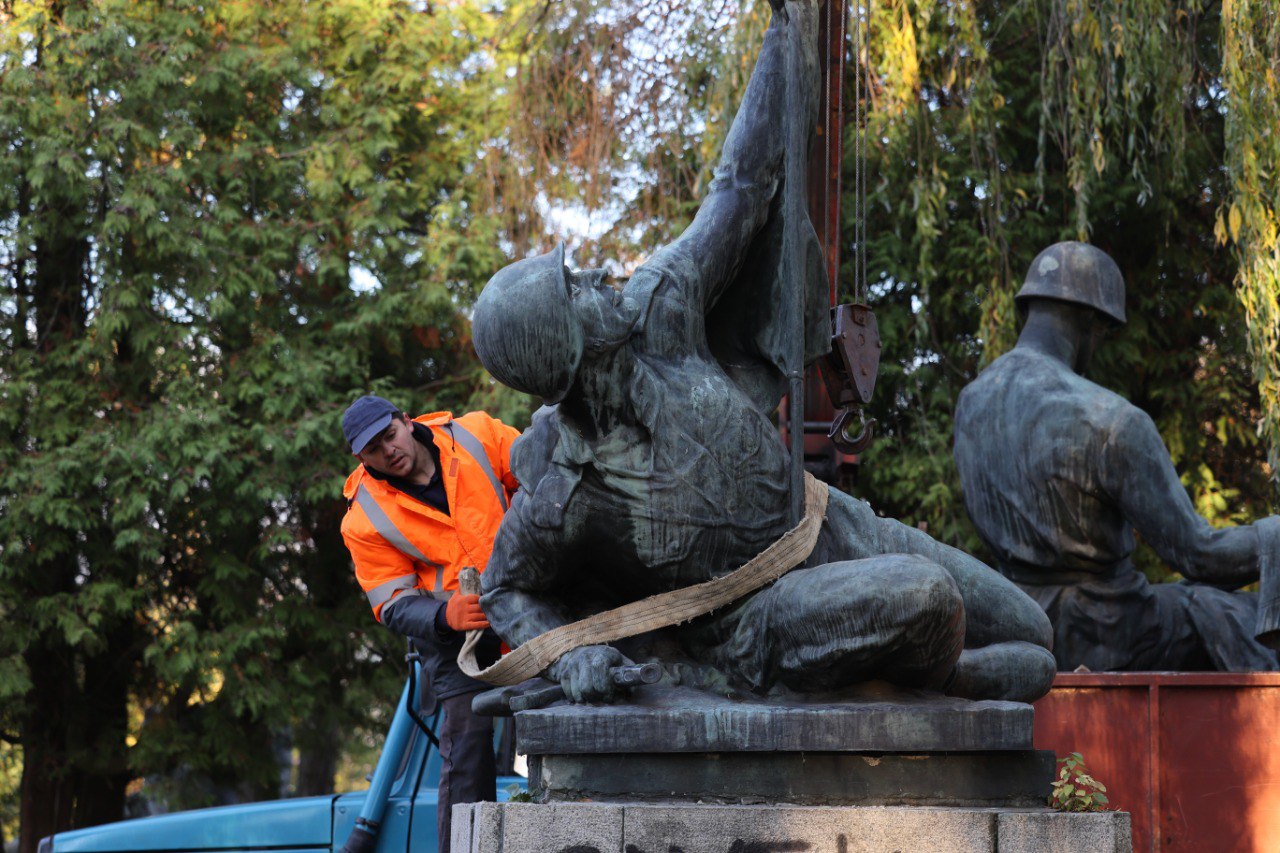 На фото: демонтаж советских памятников на Холме Славы во Львове