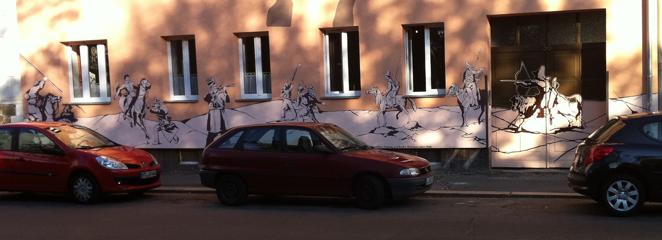 Проходя по улицам Лейпцига можно увидеть многоквартирные дома, украшенные необычными рисунками. Скачущие всадники в халатах с пиками, луками и стрелами. Довольно не обычно, для немецкого оформления жилья.