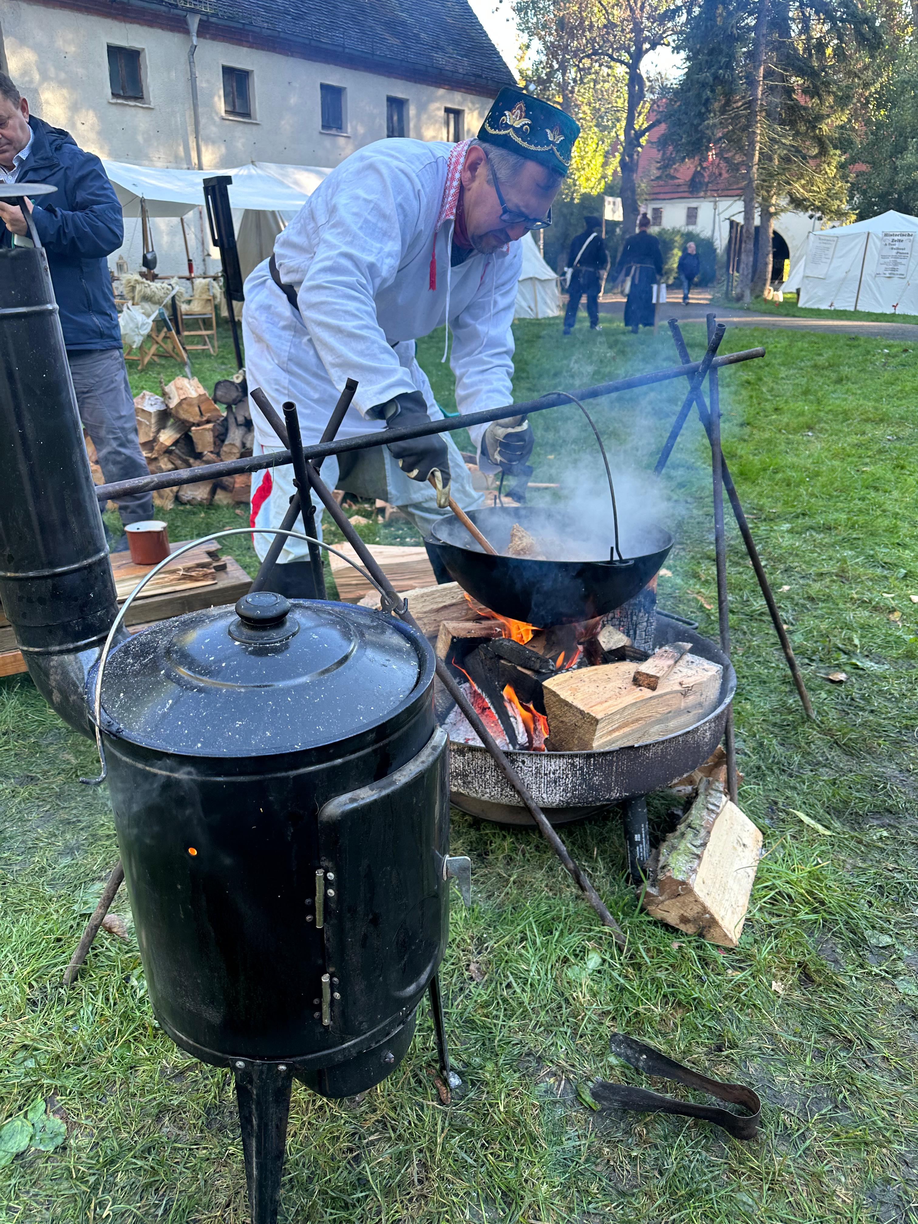 А жизнь в солдатском биваке, действительно полна романтики и простых забот. Поставить шатры и палатки, наколоть дров и развести костры! А теперь представьте: что идут дожди как 16-18 октября 1813 года (подобная погода была и в 2025 году), а бойцам нужно просохнуть и поесть. Так что, огонь — важный элемент солдатского быта. В нашем случае бороться с мокрыми дровами помогла сухая древесная стружка, любезно предложенная прусскими ополченцами! В ответ — чай из русского самовара.