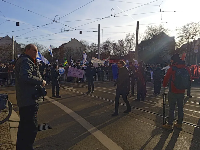 С двух сторон демонстрантов было много флагов Антифа, которые расходятся в оценке ситуации в Палестине и Израиле. Подавляющее большинство участников были жители Германии, немецкого происхождения (визуально на пропалестинской стороне их было до 70 процентов). У оппонентов были и звукоусиливающая аппаратура мобильные сцены и азарт участников. Если с сочувствующей арабам стороны было больше молодых людей 20-25 лет, то произраильская часть демонстрантов были люди постарше 30-40 лет, многие приходили с детьми на колясках (зачем откладывать субботнюю прогулку с семьей!).