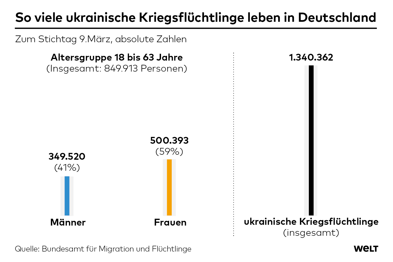 По состоянию на 9 марта 2026 года в Германии насчитывалось 1 340 362 человека, которые въехали в страну в связи с войной в Украине. Среди них 349 520 мужчин и 500 393 женщины в возрасте от 18 до 63 лет. Об этом пишут немецкие СМИ со ссылкой данные Федерального реестра иностранцев.