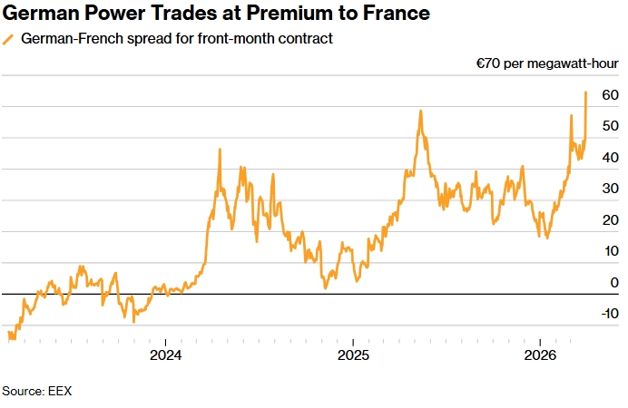По данным EEX, во вторник немецкие контракты на майскую поставку электроэнергии торговались по цене 86,80 евро за мегаватт-час, в то время как во Франции этот показатель составлял 22,06 евро за мегаватт-час. Почти в четыре раза дешевле...