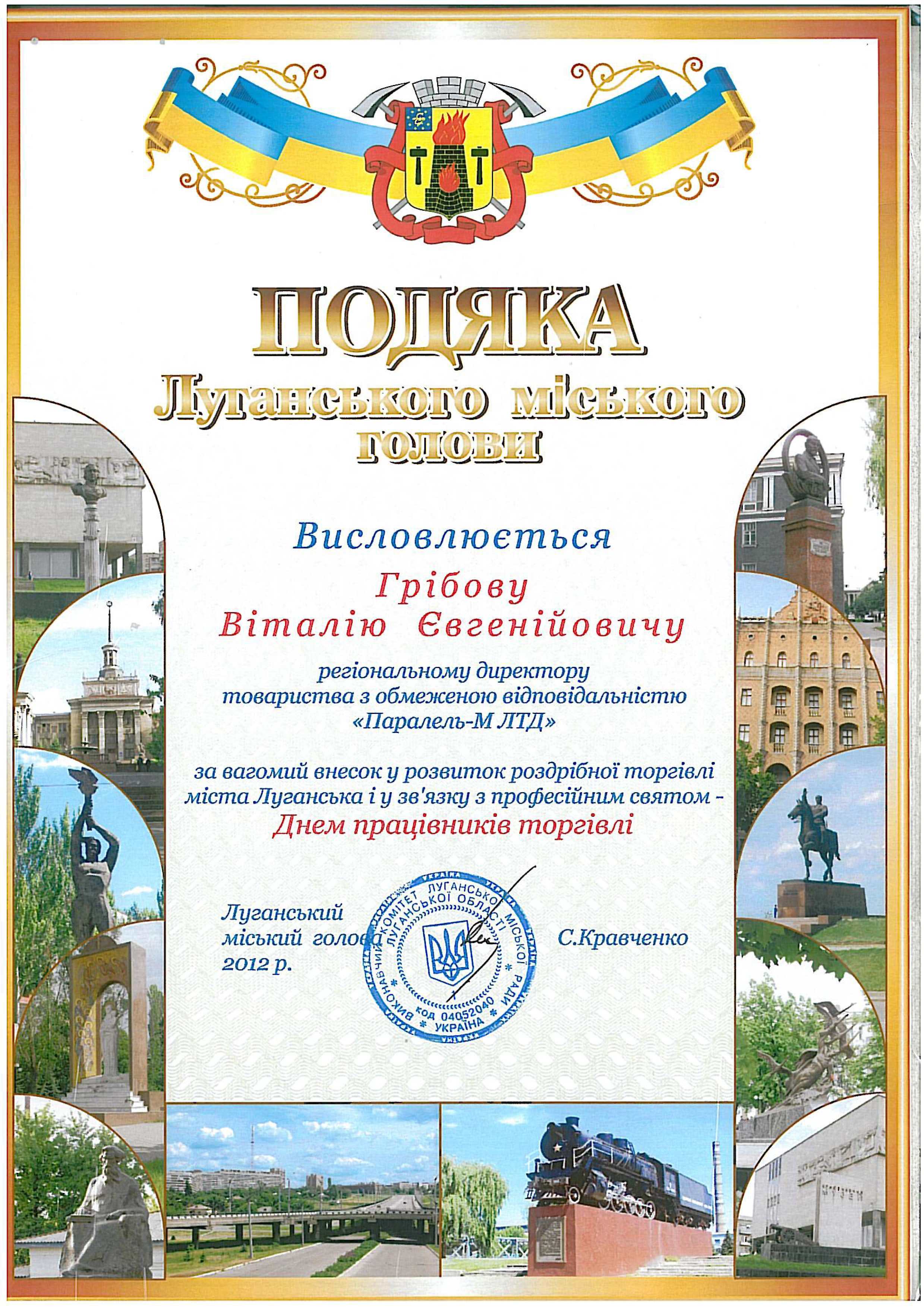 Коллекция наград и благодарностей компании «Параллель» пополнилась еще одним ценным экземпляром. Луганский исполнительный комитет вручил почетную грамоту крупнейшему нефтетрейдеру Востока Украины в лице регионального директора в Луганской области Виталия Грибова. Награждение приурочено ко Дню торговли, который в этом году празднуется 29 июля в Украине. Грамота отмечает заслуги компании «Параллель» в Луганском регионе и её весомый вклад в развитие цивилизованной торговли.