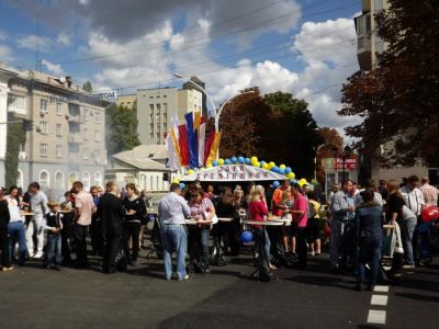 В настоящее время на площади работники предприятия «Дары Кременщины» жарят мясо одновременно на трех мангалах для всех желающих.