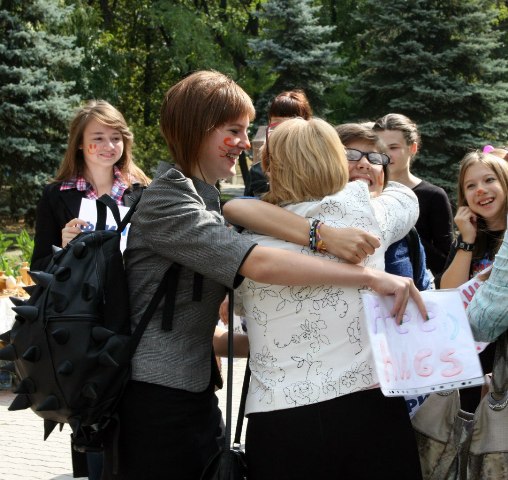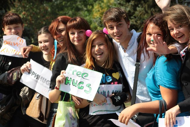 Таким образом, молодежь решила поздравить Луганск с Днем рождения. На вопрос – не страшно ли было обниматься с незнакомыми людьми, участницы Влада и Таня ответили просто: «Нет, конечно, нам кажется это они пугались когда мы подбегали к ним всей толпой!». И, правда, луганчане реагировали по-разному – кто-то отказывался с улыбкой, кто-то наоборот – начинал кружить в воздухе или лез целоваться, кто-то испуганно поднимал брови. Но в большинстве случаев реакция была позитивной.