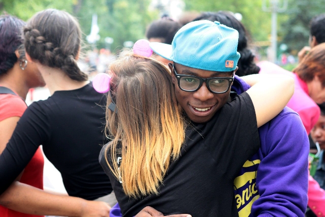 9 сентября группа молодых людей с разрисованными лицами и разноцветными плакатами захватила сквер им. Молодой Гвардии, обнимая всех прохожих. Об этом информагентству Сxid.info сообщили организаторы акции.